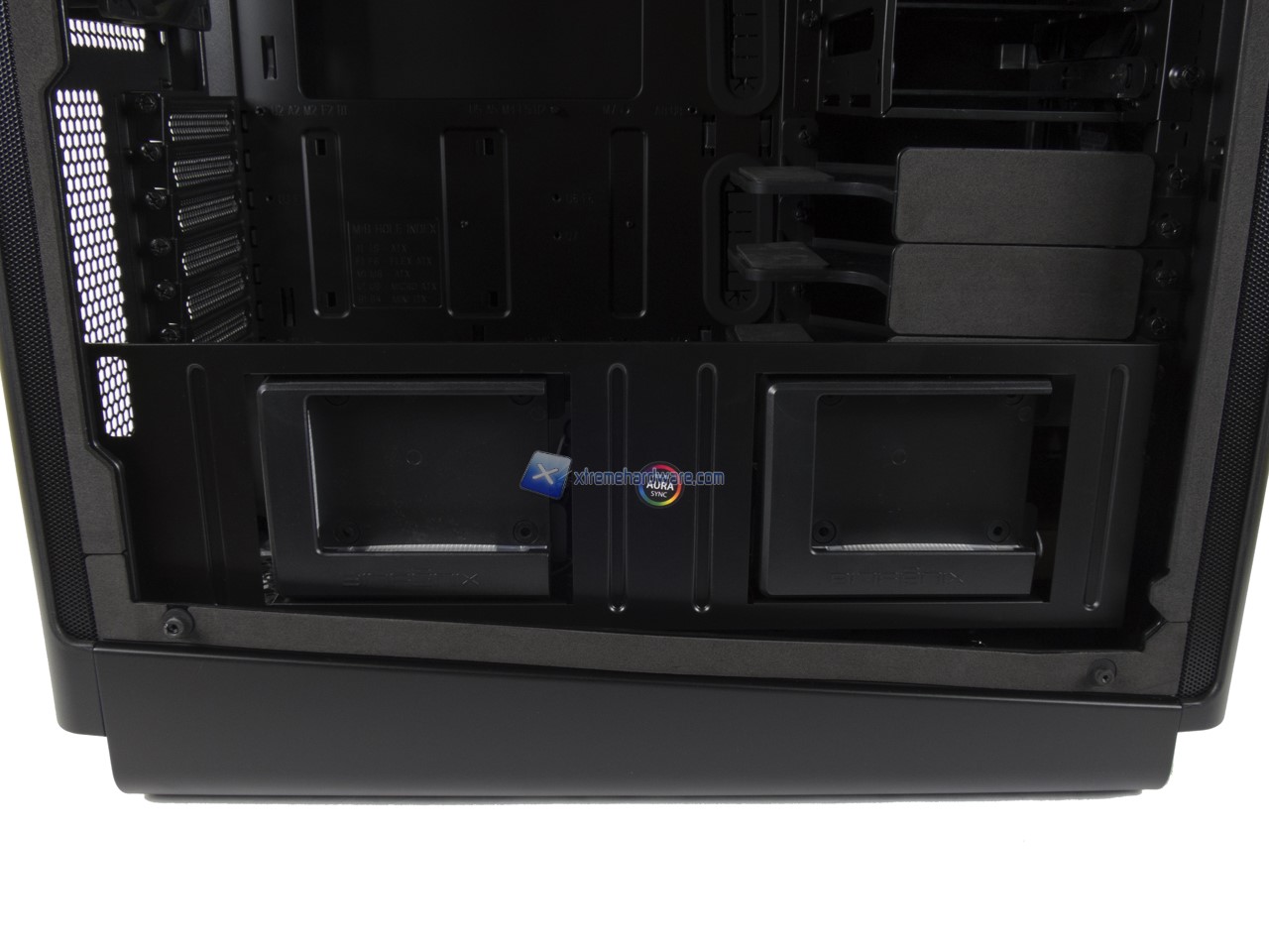 Nella parte inferiore è difficile non notare il supporto orizzontale in metallo con il sistema di illuminazione BitFenix SSD Chroma e i due alloggiamenti per SSD. Sistema che abbiamo visto già con il BitFenix Aurora (QUI la recensione).